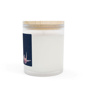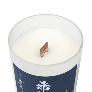A soft indigo or white candle jar with bold Kanji and a delicate crane motif.